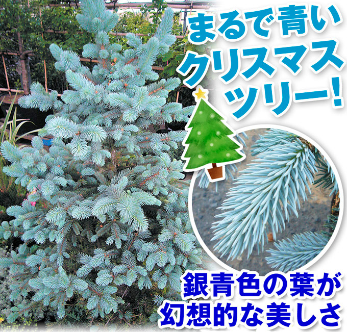 ●商品情報 :葉の銀青色が特に強く美しくなる針葉樹。生育がゆっくりで、大樹になると感慨深い。シンボルツリーや青いクリスマスツリーに!