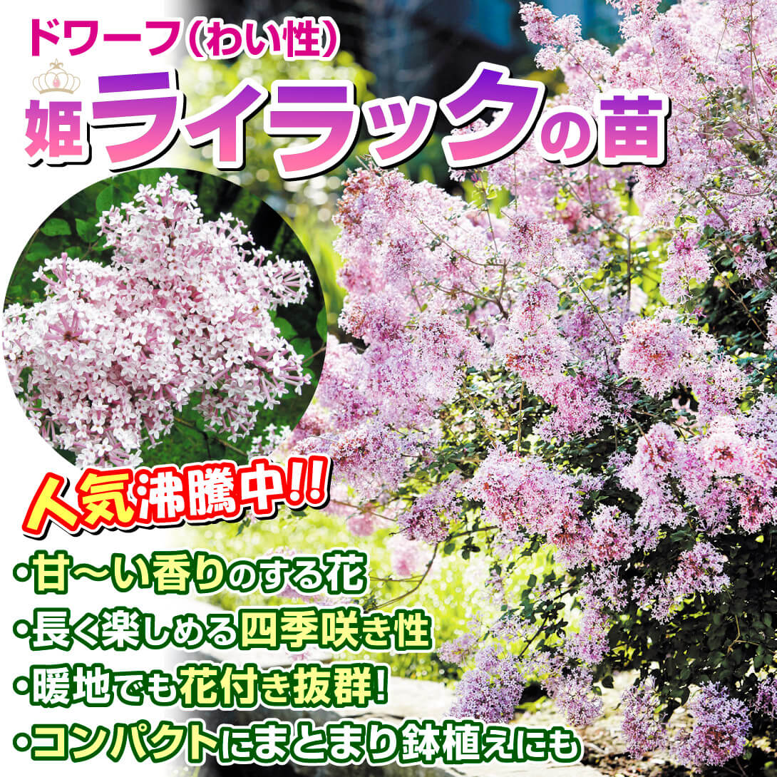 ●商品情報:コンパクトにまとまる四季咲き性ライラック。矮性種なので鉢植えにも最適です。この「ジョシー」は暖地でも花つき抜群で、甘~い香りを漂わせます。
