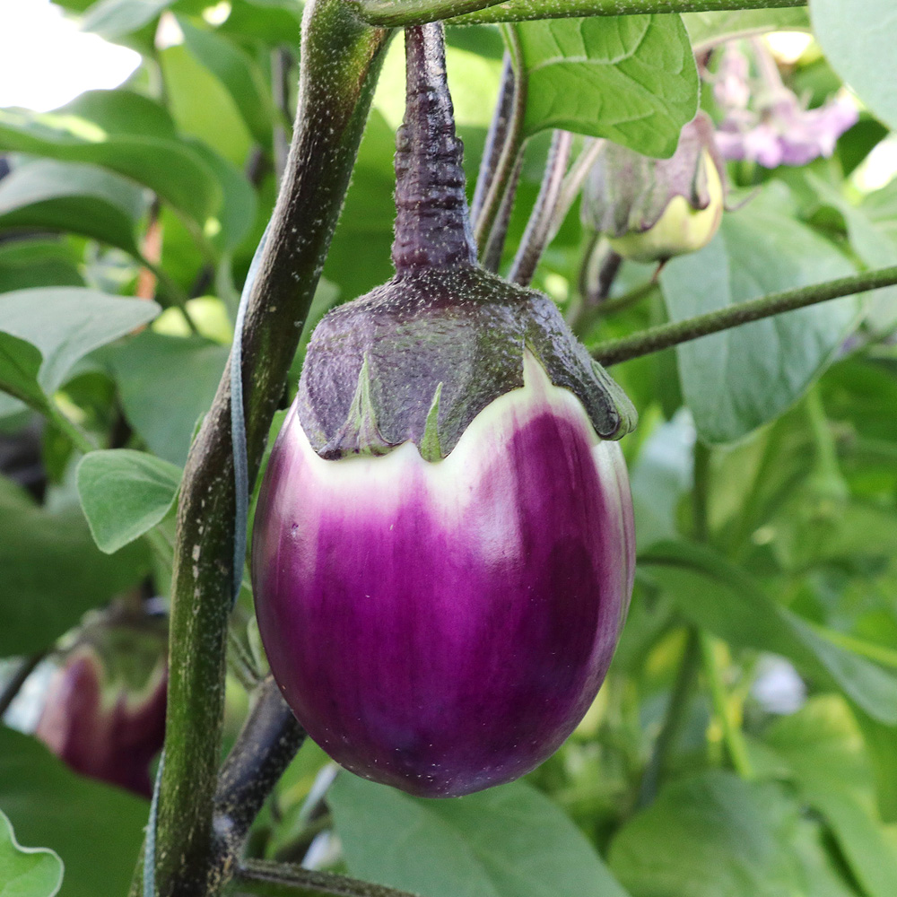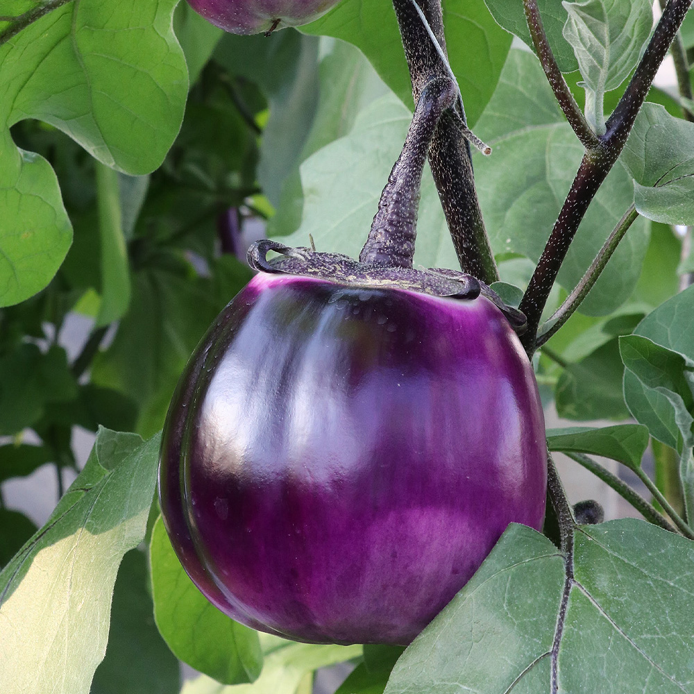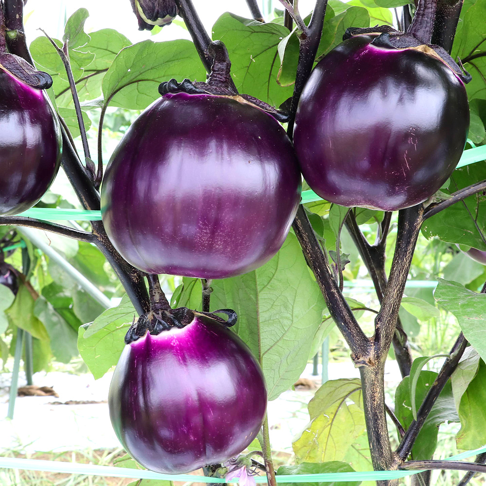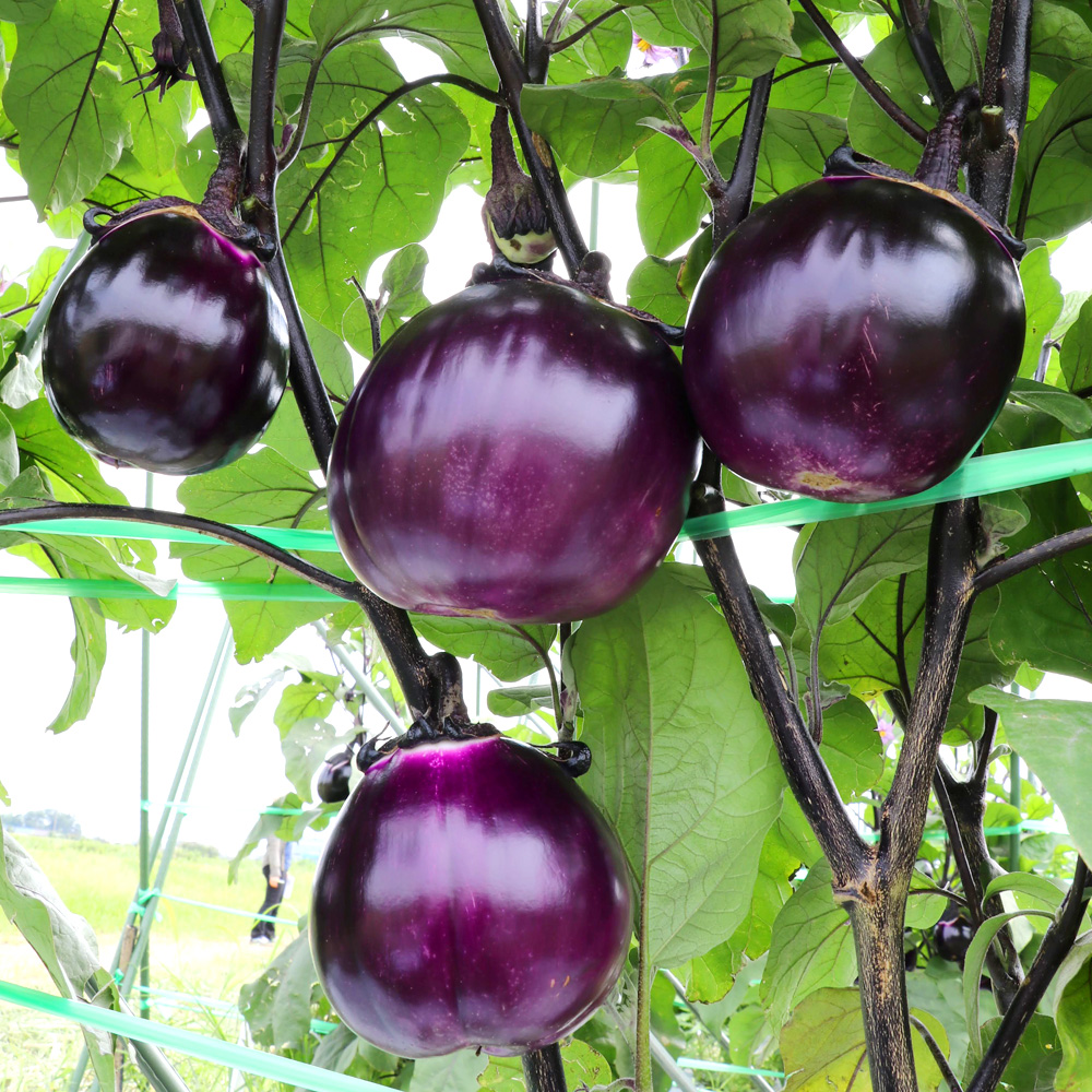 最大果重580g、長さ16cm、直径14cmのソフトボール大にもなるビッグサイズのナス!! 果皮は鮮やかな紫色でツヤがあり、果肉は綺麗な白色で、とてもやわらかく肉厚。日本のナスに比べ水分が少なく実がしまる「フィレンツェタイプ」で、加熱することでトロッと、クリーミーな食感に激変!!油との相性が抜群で、ステーキやソテー、田楽などのグリル料理が最高に美味しい。草勢強く栽培も簡単で、収穫量も多い!!