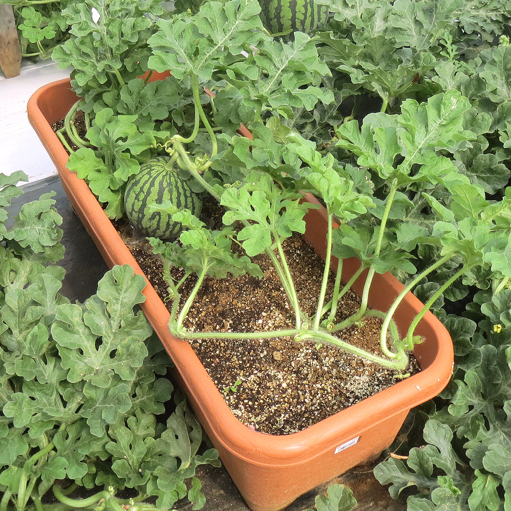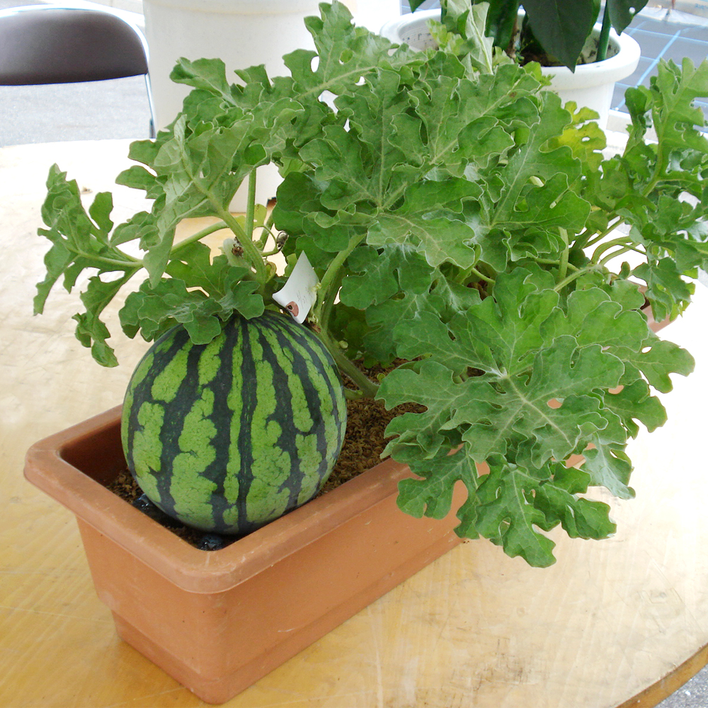 ツルの長さが従来品種の1/4と短く、プランターでも栽培でき、ベランダなどでも栽培可能!! 糖度も十分あり、裂果も少ない。