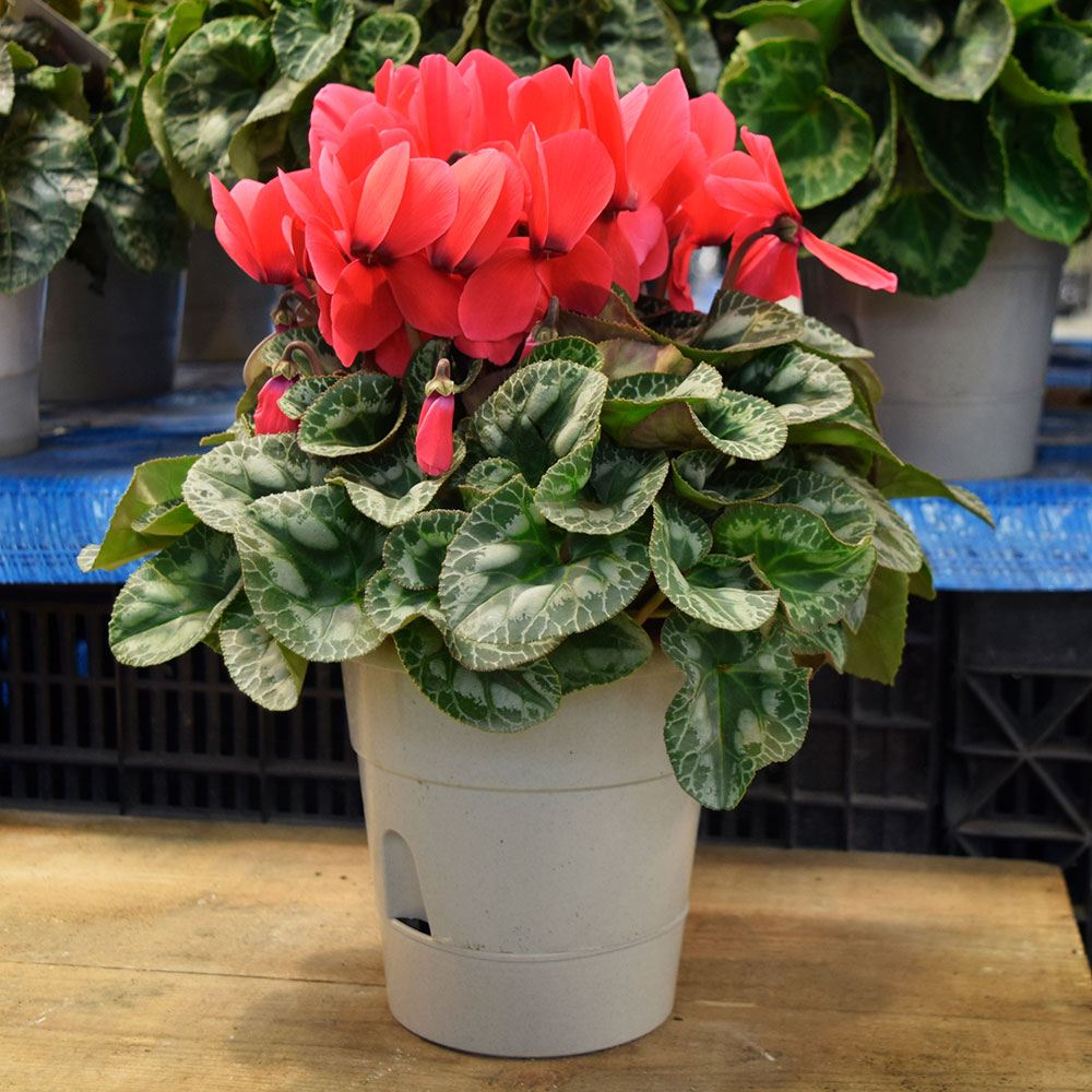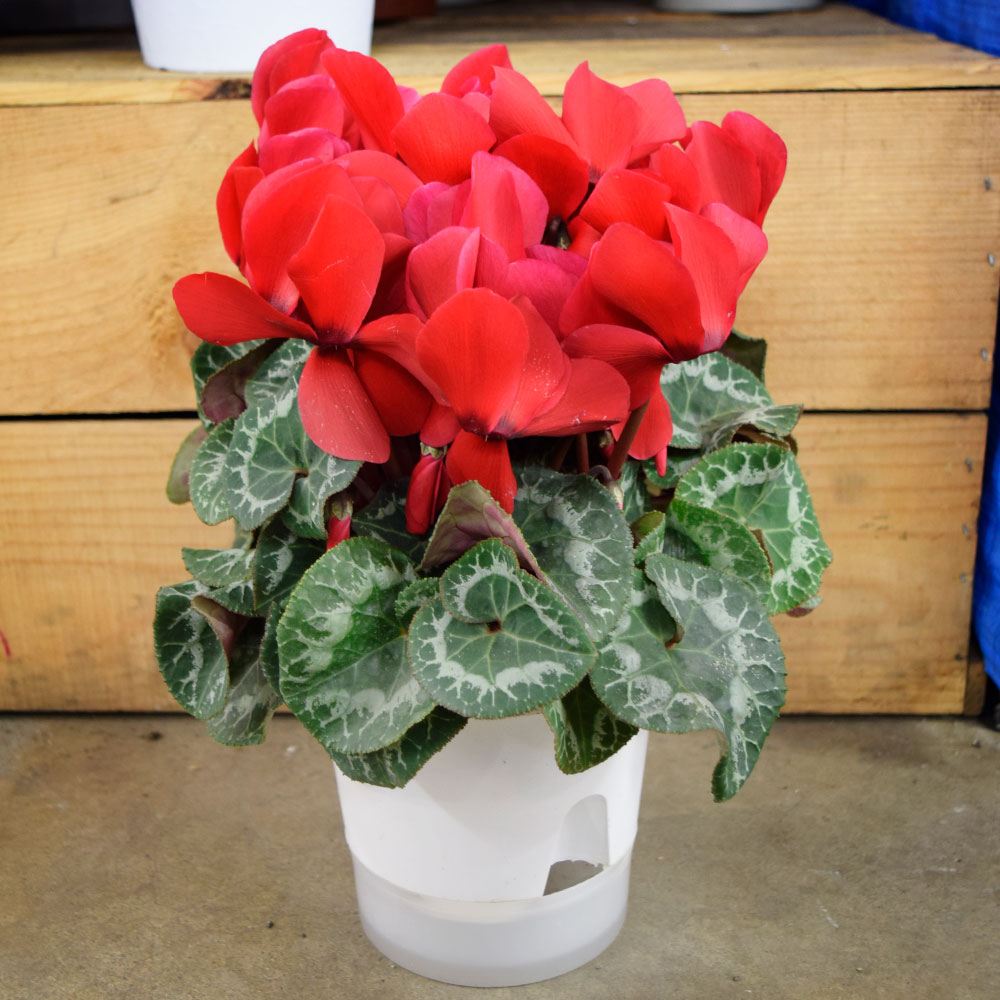 冬の鉢花の定番「シクラメン」。冬の室内を明るく彩ってくれます。1鉢あたり798円の大特価価格です!花色・品種などはおまかせです。何が届くかお楽しみに! サクラソウ科。