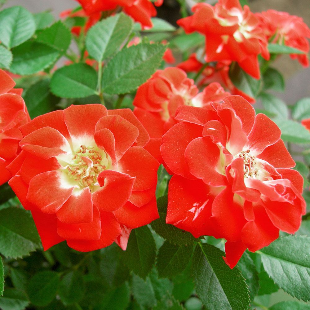 「リトルカーニバル」は朱色の鮮やかなミニバラです。房咲きで花つきよく、花もちも良い。