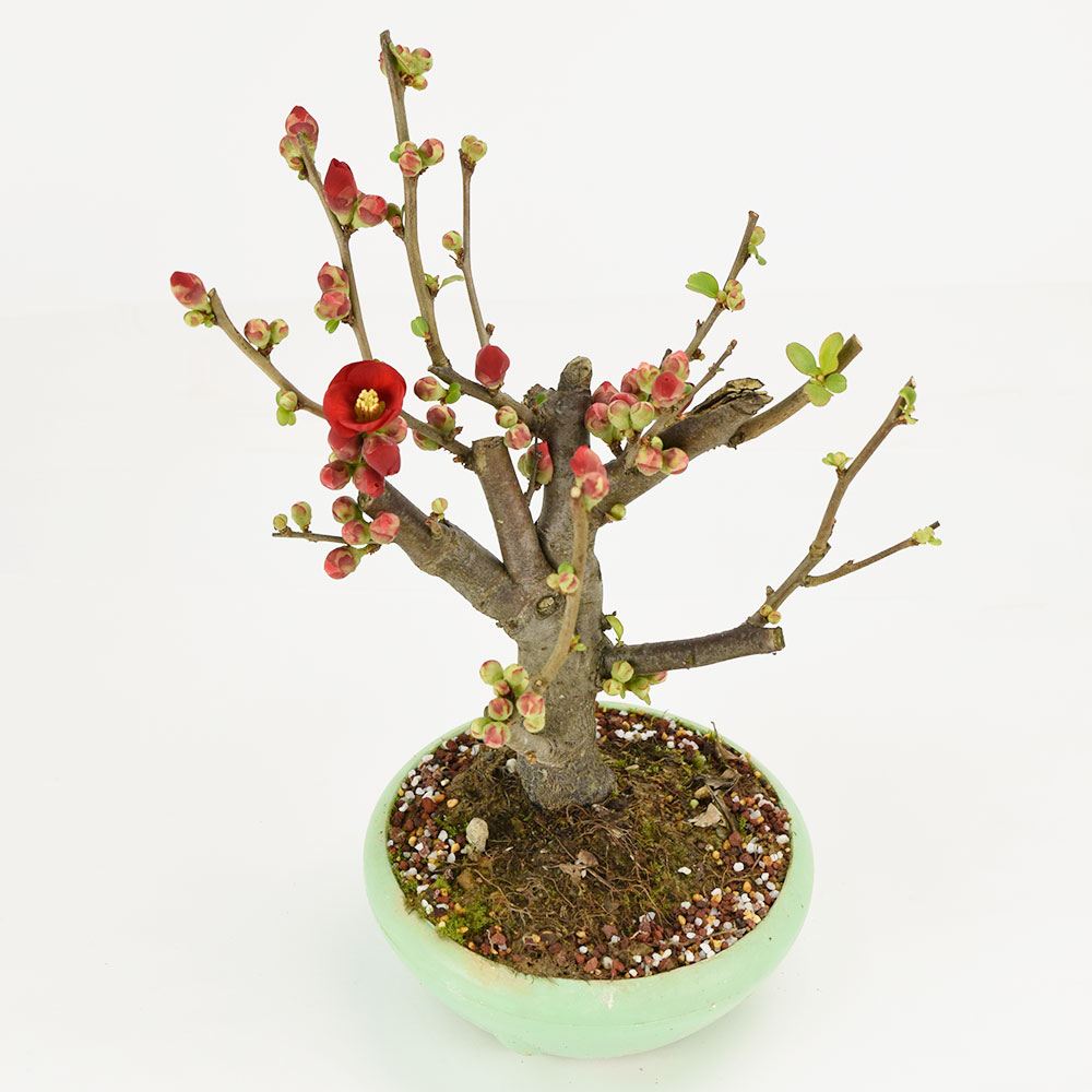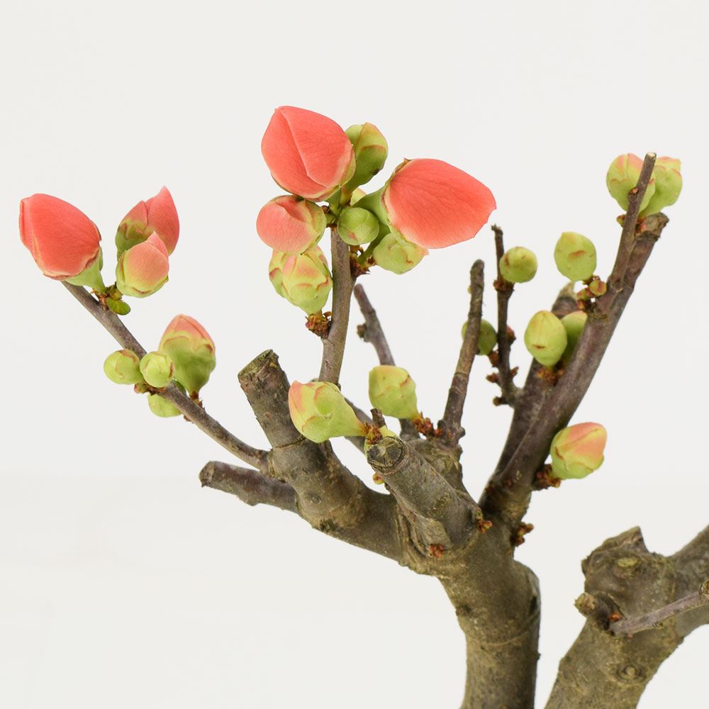 春を華やかに彩るボケの花。花芽が付いた状態でお届けするので、そのままお楽しみいただけます。お花が咲いている間は、室内でも栽培可能。