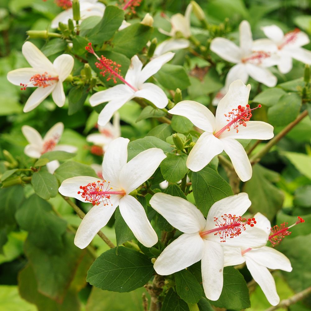 ハワイ原産で、入手困難な原種系ハイビスカスの。葉がとても大きく花はワイメアエよりも小さく芳香あり。白に赤い柱頭がかわいく、しかも多花性!
