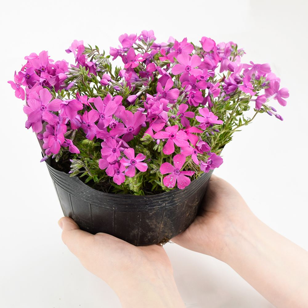 春の花壇で大人気の芝桜。15cmポットから飛び出そうな勢いの根っ子の張り具合で、この春から満開の花が楽しめます。