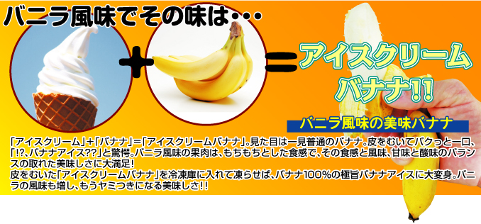 アイスクリームバナナ:関東以西の温暖地なら露地植え可能なバナナ!! 味は「アイスクリーム」+「バナナ」=「アイスクリームバナナ」。見た目は一見普通のバナナ。皮をむいてパクっと一口、「!?、バナナアイス??」と驚愕。バニラ風味の果肉は、もちもちとした食感で、その食感と風味、甘味と酸味のバランスの取れた美味しさに大満足! 皮をむいた「アイスクリームバナナ」を冷凍庫に入れて凍らせば、バナナ100%の極旨バナナアイスに大変身。バニラの風味も増し、もうヤミつきになる美味しさ。