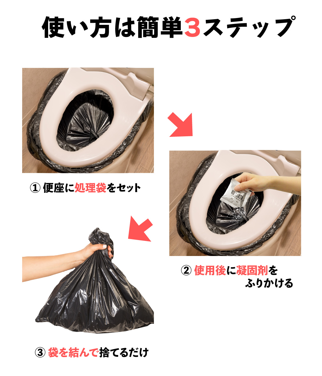 便器などに汚物袋を被せて、排泄。そのあとに凝固剤を振りかけ、固まったのを確認。使用後はしっかりと袋を締め、自治体の条例にしたがって可燃ゴミへ。