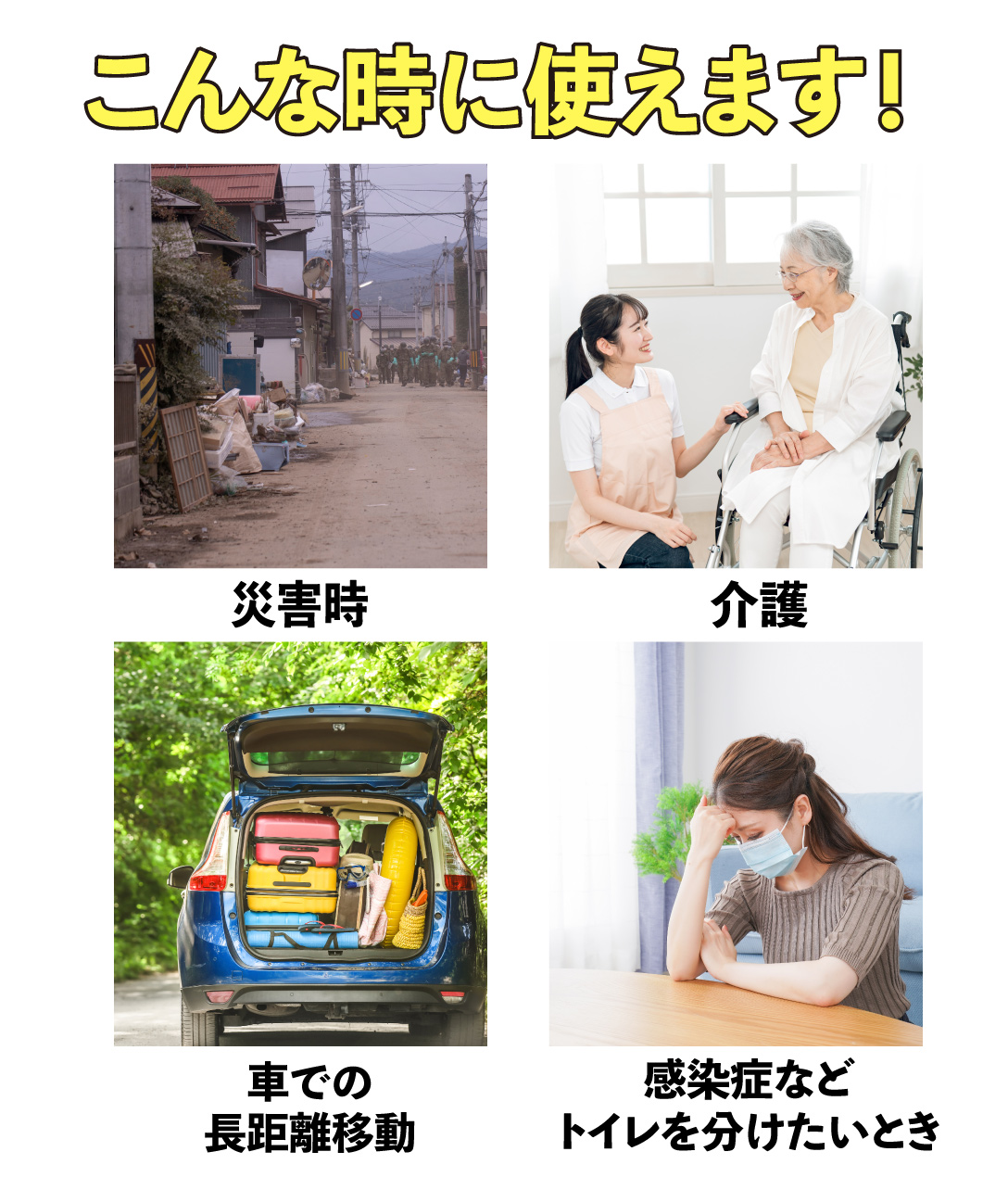 非常用トイレは災害時以外にも大活躍。キャンプなどのアウトドア、交通渋滞に巻き込まれたとき、介護など様々な場面で使用可能。