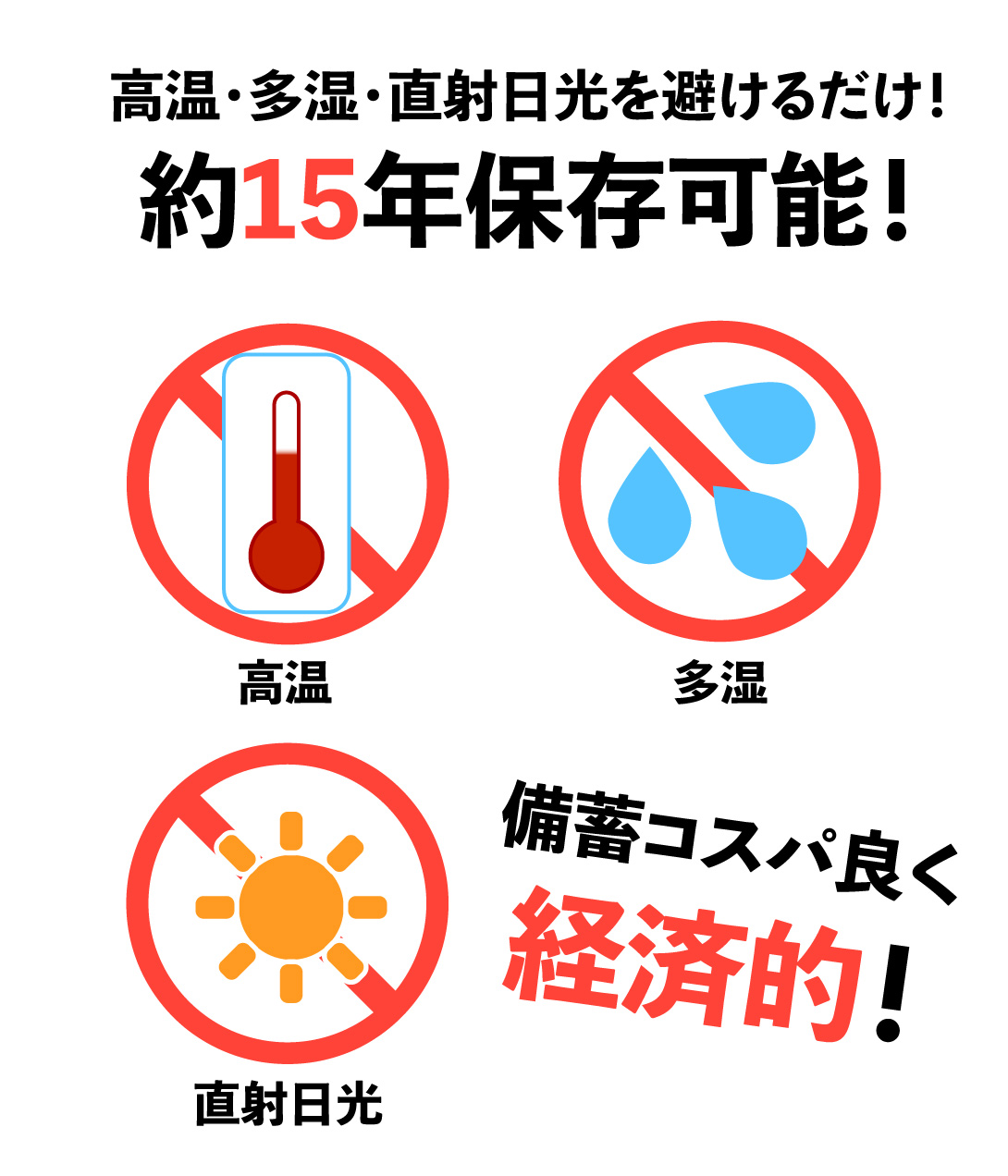 高温多湿、直射日光を避けると約15年間保存可能。万一に備えて、1人1人備えておくことをオススメします。