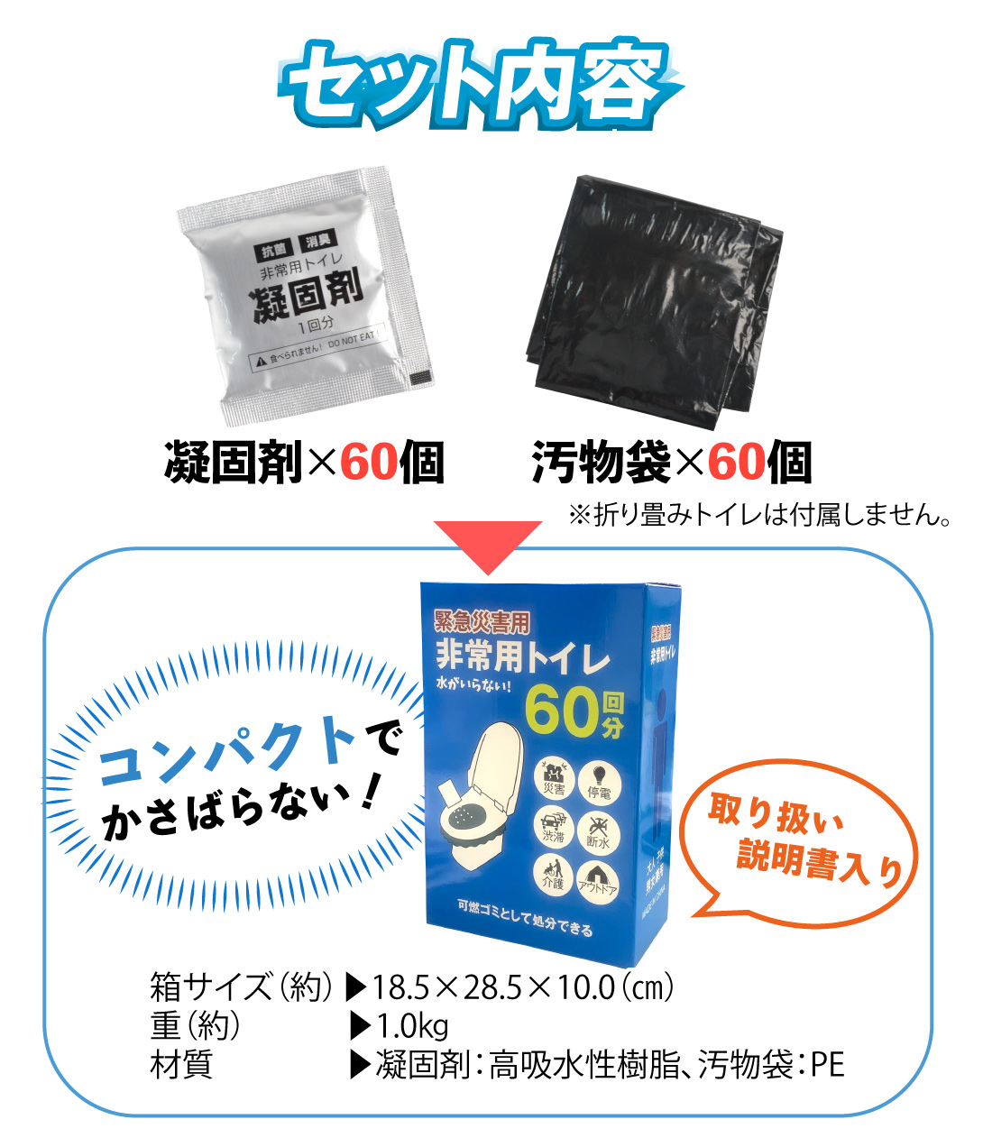 凝固剤(高吸水性樹脂)60袋、汚物袋60枚、取扱説明書
