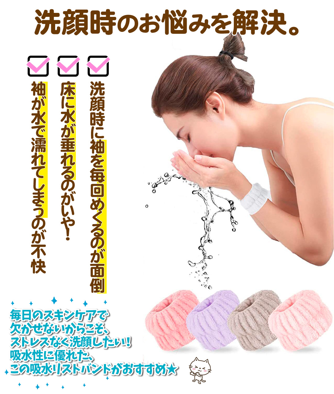 洗顔時にいつも袖や腕が濡れて困っている方に最適なリストバンドです。