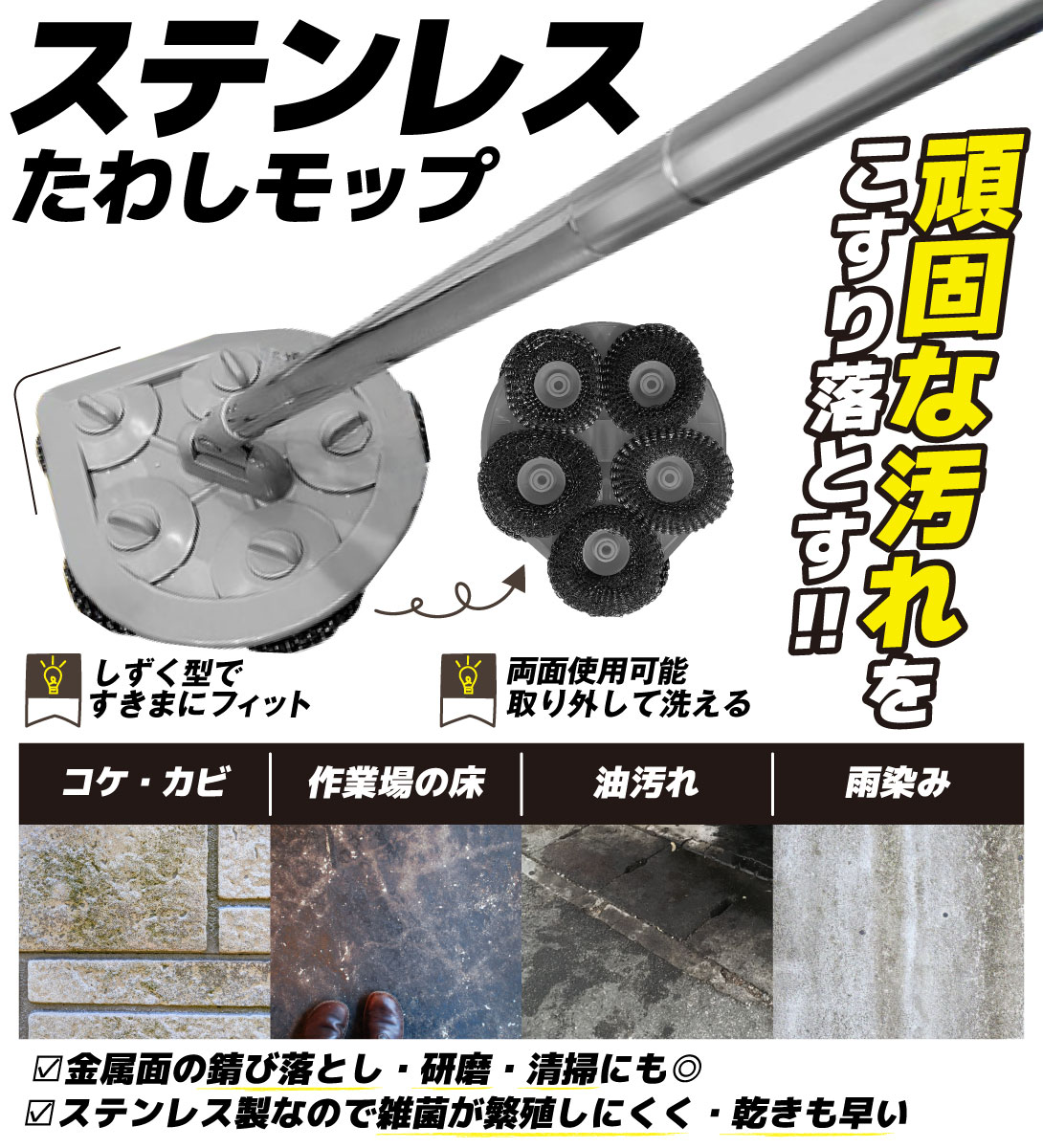 ステンレスたわしモップ 1個 時短 こすり洗い 研磨 清掃 頑固な汚れ 掃除 コケ カビ 油汚れ 雨じみ デッキブラシ 国華園