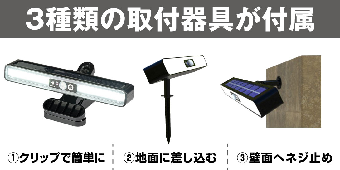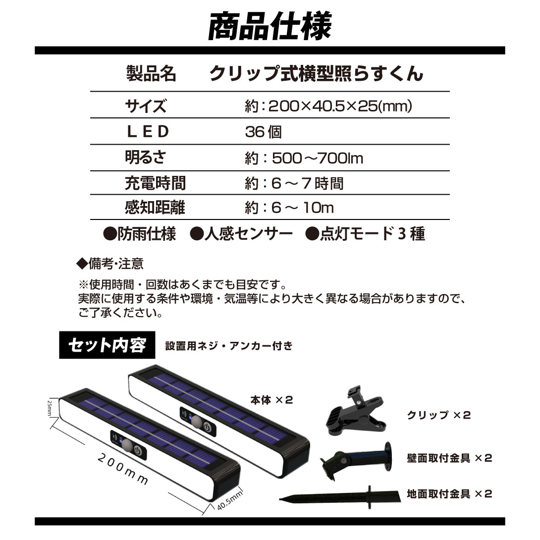 本体×2、クリップ×2、地面取付用金具×2、壁面取付用金具×2、設置用ネジ・アンカー付き