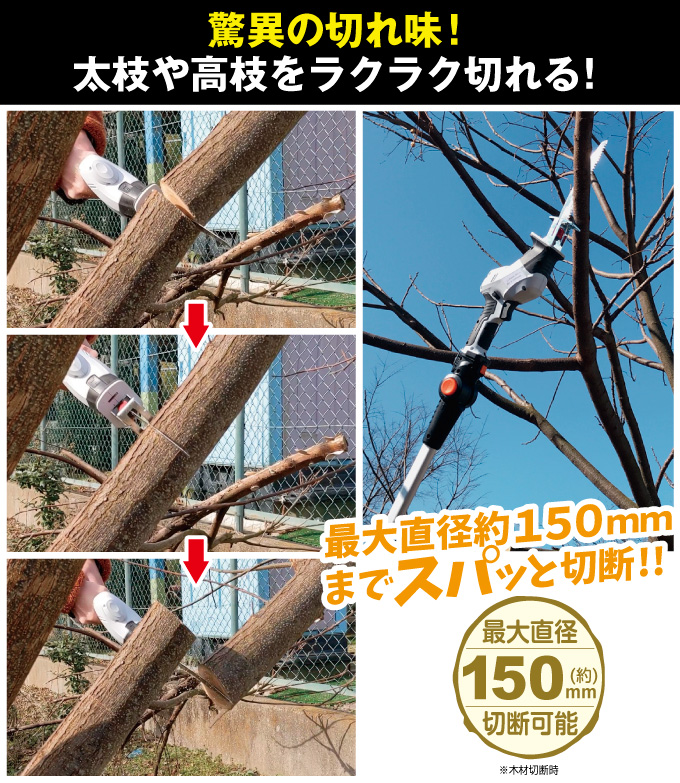 最大直径150mmまで切断可能!太い枝もスパッと切れる!! |