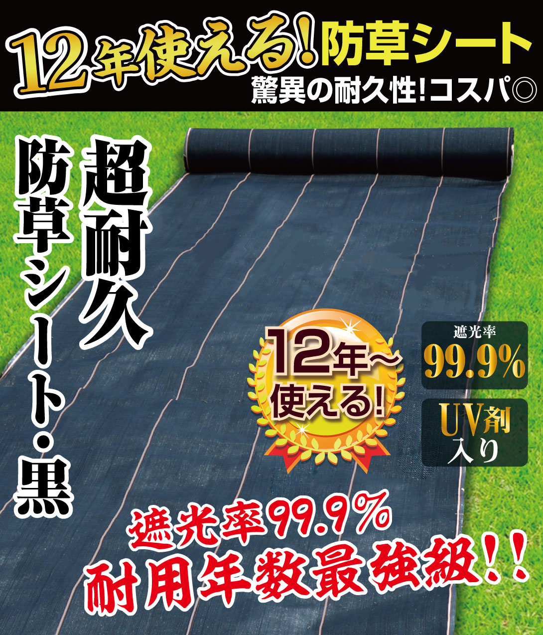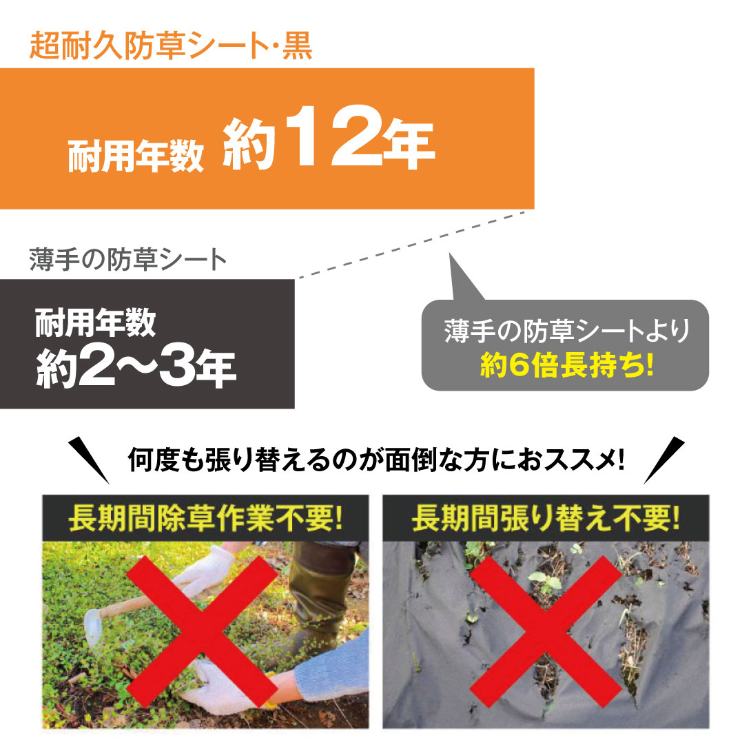 超耐久防草シート・黒 防草シート 除草 雑草 芝生 草 DIY 耐用年数 12年 厚さ0.8mm 砂利下 人工芝