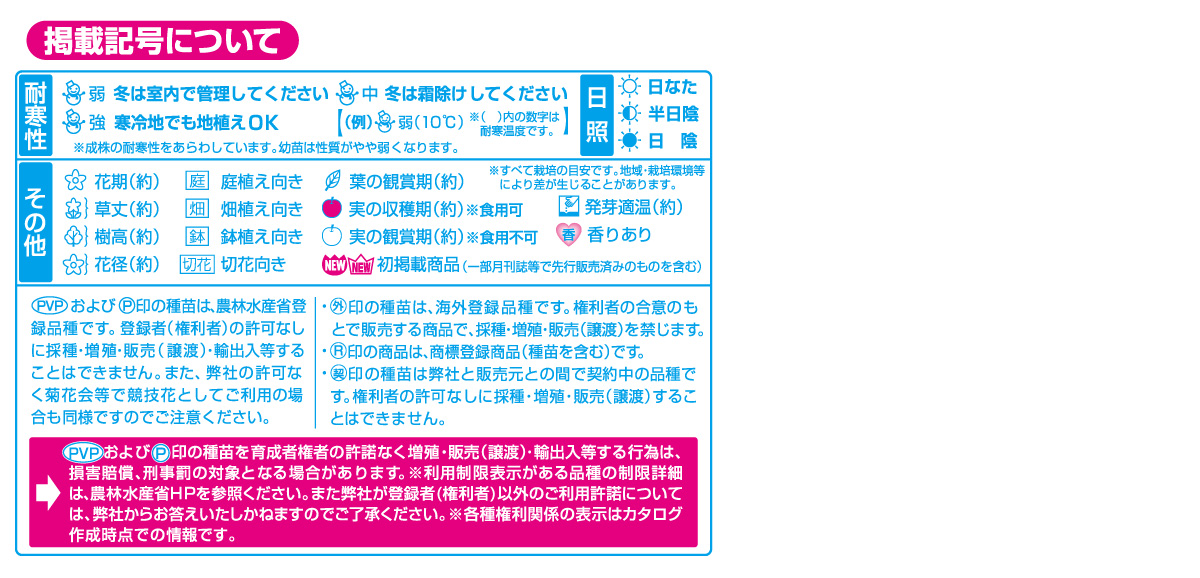 ●種子の発芽は、播種後の栽培条件等により結果が異なる場合があります。播種や植え付け後のお客様の栽培管理や、気象条件によると考えられる不具合についてはその責を負いかねます。地域やその年の気象条件の違いにもご注意ください。